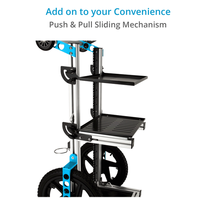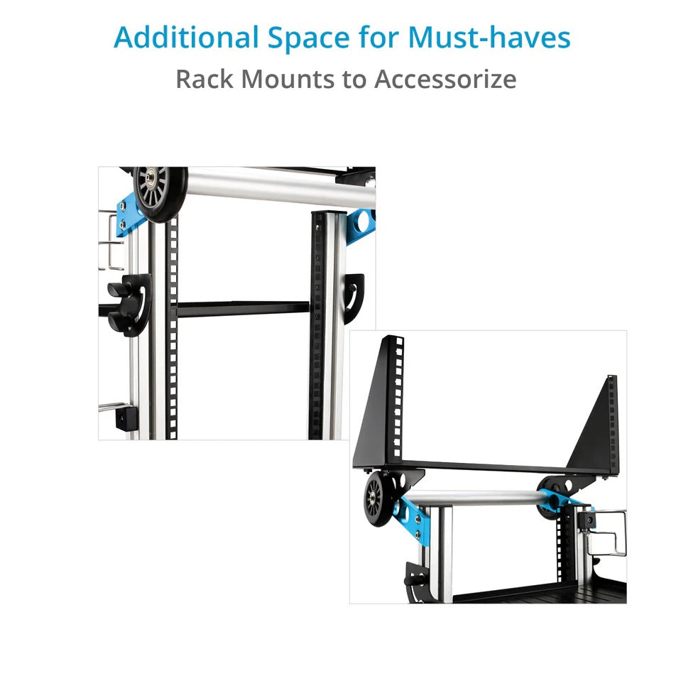 このカートは、あなたの機材構成に合わせて調整・カスタマイズが可能です。3段の棚とラックマウントアダプターが付属しています。 上から1段目と2段目の棚は、工具不要で高さを調整したり、折りたたんだりすることができます。2段目の棚はスライド式になっており、ミキサーなどへのアクセスを容易にします。一番下の棚は固定式で、カート全体の強度と安定性を高めています。