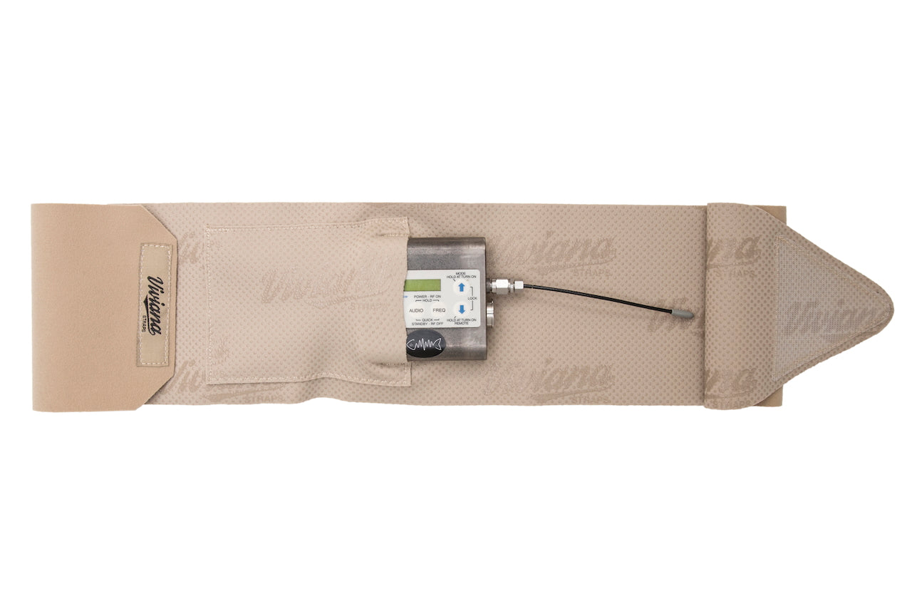 水平のポーチが送信機のアンテナを横向きに寝かせ、衣装の裾からの飛び出しを完全に防ぎます。さらに、ストラップ自体の幅もスリムなため、身体のラインに完璧にフィットし、装着していること自体を気付かせません。